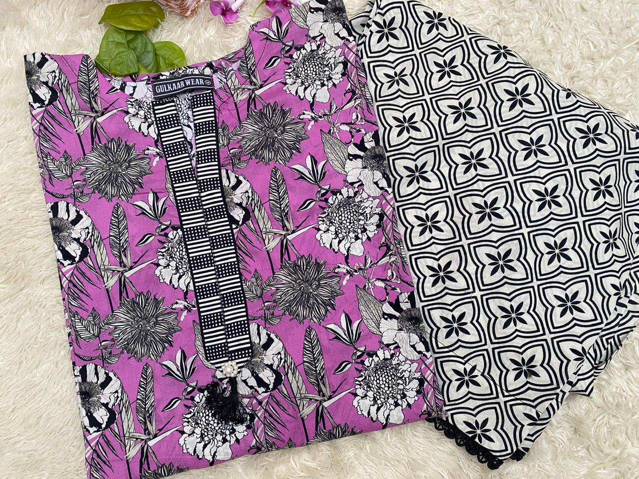 This 2-piece cotton pret by Gulkar Wear features a baggy floral shirt with graceful neckline in light purple, black, and egg white paired with Farshi trousers. Designed in breathable cotton, it’s perfect for casual outings and everyday elegance.